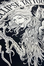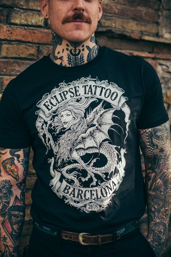 Camiseta Eclipse Tattoo Barcelona diseñada por David Tejero. Estampado por corrosión en camisetas 100% algodón orgánico Stanley/Stella creator 180gr. Estampadas manualmente una por una por Newtownlab. Diponible en cuatro tallas, S, M, L and XL. Estoc limitado.