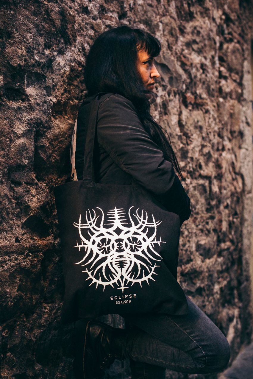 Descarga sobre bolso negro de algodón orgánico y reciclado.