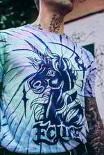 Unicorn T-shirt designed by David Kohlver. Printed on Earth Positive Tie Dye Tee, 100% combed organic cotton, vegan and climate neutral.